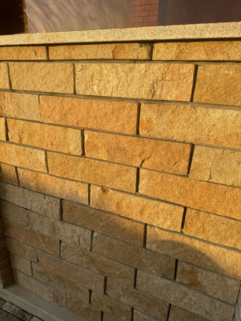 Жёлтый гранитный кирпич — это отделочный камень, вырезанный из натурального сортового гранита с золотистыми, охристыми, песчаными и янтарными тонами. Используется в фасадной и цокольной облицовке, а также в декоративных наружных и внутренних решениях. Жёлтый оттенок добавляет тепла в архитектуру, особенно эффектно выглядит на солнце и в контрасте с тёмной кровлей.