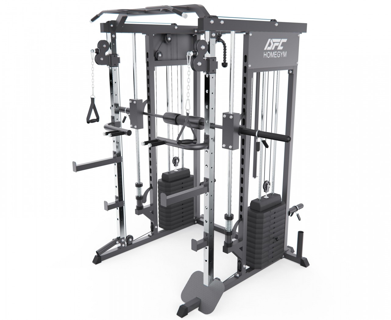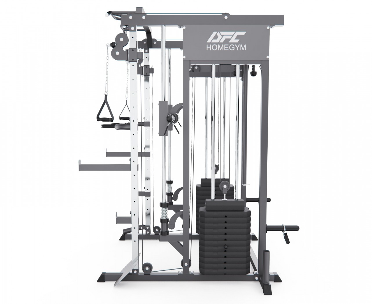 Машина Смита DFC D8201 — это полноценный домашний тренажёрный комплекс, который сочетает в себе возможности силовой рамы, модульных рукоятей и блоковых систем.