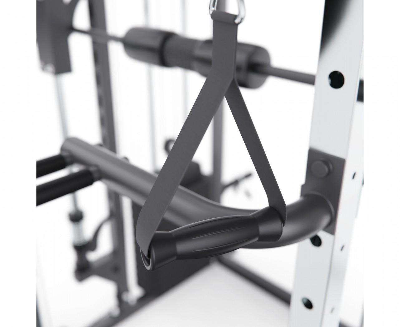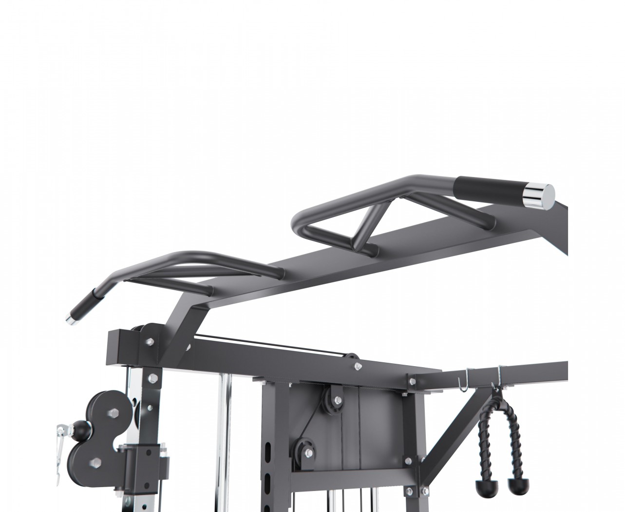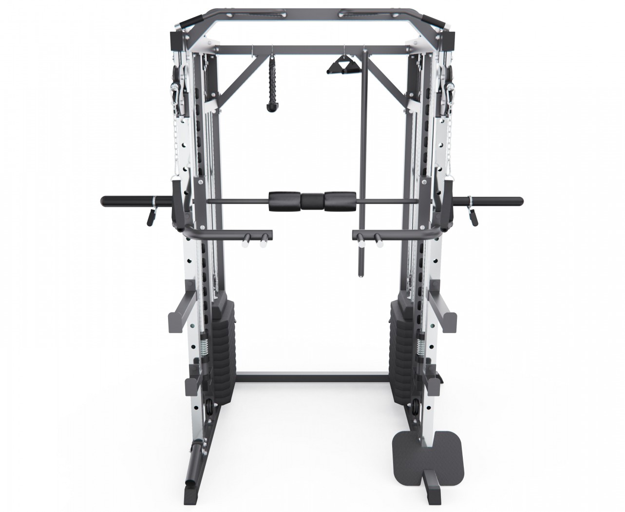 Тренажёр оснащён верхними и нижними блоками, а также набором рукоятей: прямая, V-образная, манжета для ног и дополнительные адаптеры. Система тросов использует тросы длиной60 сми диаметром5 мм, оснащённые пружинами и фиксаторами, что обеспечивает плавный ход, точную регулировку нагрузки и долговечность в условиях интенсивной эксплуатации. На стойках расположены держатели для весовых пластин, а встроенный гриф имеет длину80 сми толщину5 мм, что обеспечивает удобную загрузку дисков и стабильную работу при выполнении упражнений.