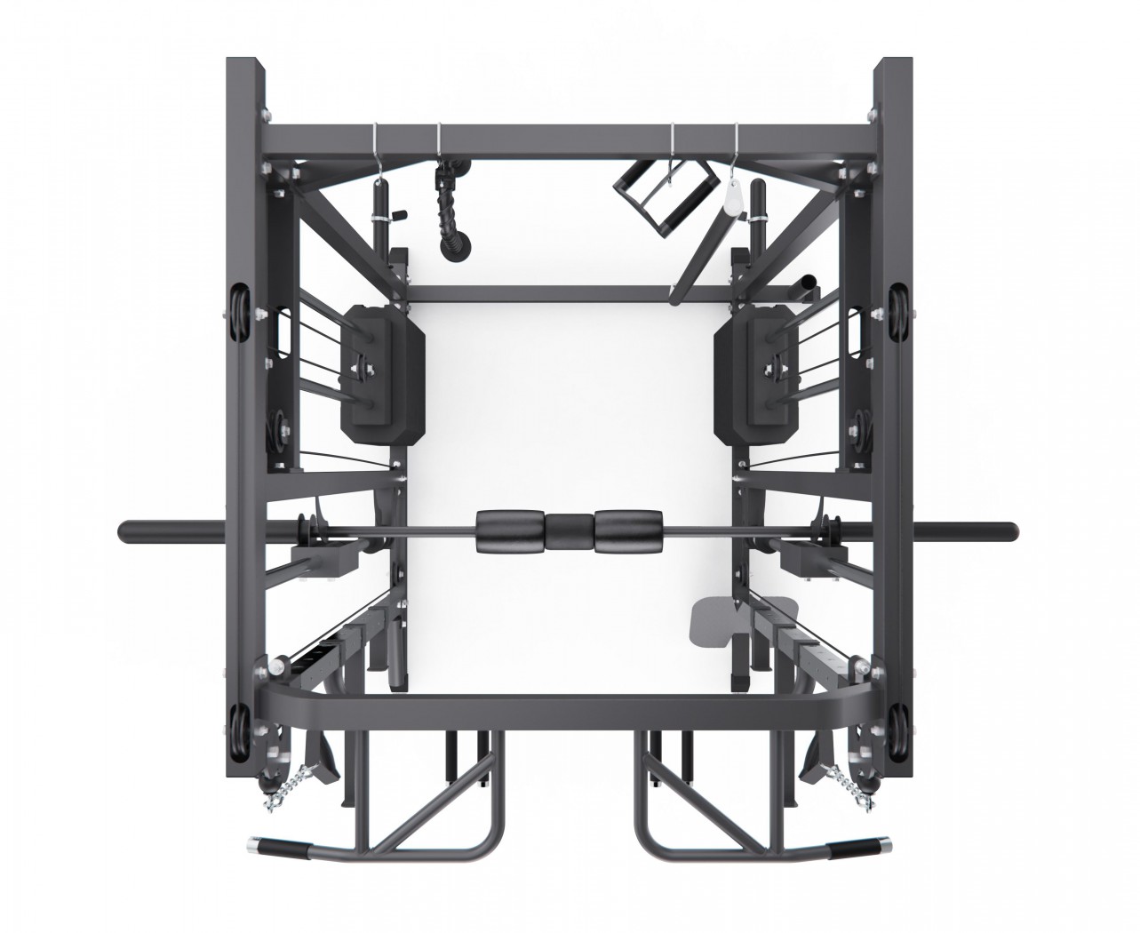 Конструкция объединяет прочие элементы рамы, балки, стойки, рукояти, держатели и предохранители, формируя единую многофункциональную и надёжную систему. Рама выполнена из стального профиля 75 х 50 х1,5 мм, что обеспечивает высокую жёсткость и устойчивость конструкции при работе с большими весами и гарантирует безопасные и разнообразные тренировки.
