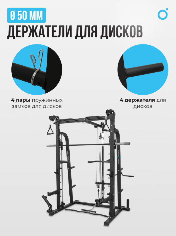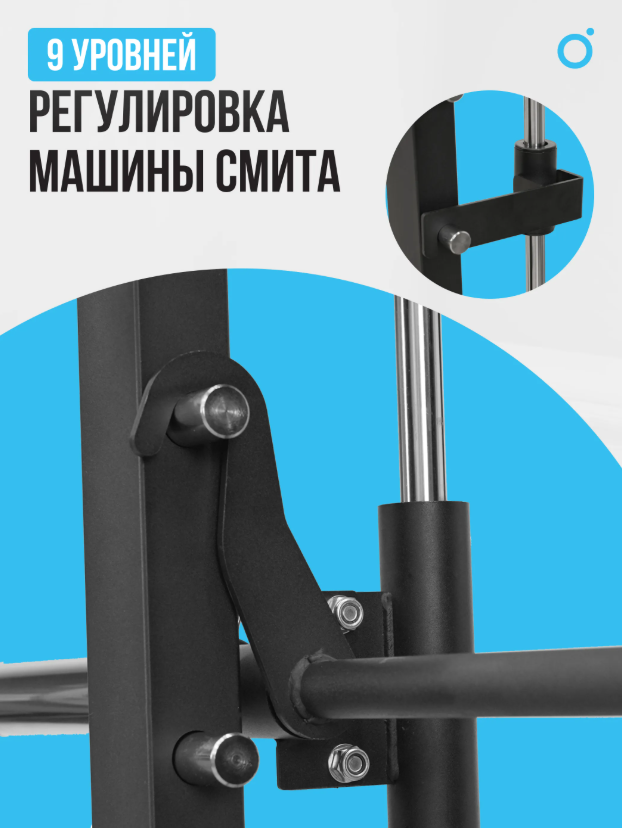 Гриф -197 см, ф50,14 кг, 9 уровней регулировки по высоте, стакан для хранения грифа, 4 пружинных замка для грифа. Силовая рама. Машина Смита. Многопозиционный турник. Многопозиционные брусья. Двойная тяга. Гребная тяга. Шарнирный крепеж грифа. |
