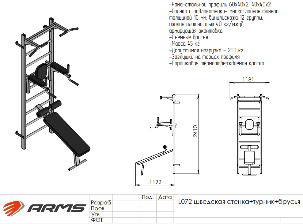 Многофункциональный комплекс Шведская стенка турник брусья скамья для пресса ARMS L072-1 vasilgym