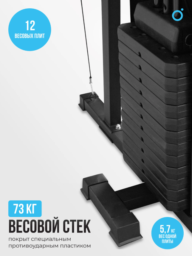 Силовой комплекс OXYGEN FITNESS SITKOR — это идеальное решение для тех, кто стремится к разнообразным тренировкам и эффективным результатам. Он сочетает в себе множество функций, позволяя пользователю прорабатывать все группы мышц. Система включает в себя турник, брусья, скамью, боксерскую грушу и многое другое, что делает его универсальным инструментом для занятий как для новичков, так и для опытных спортсменов. Силовой комплекс имеет компактные размеры: в рабочем состоянии его длина составляет 220 см, ширина — 210 см, а высота — 227 см. Общий вес комплекса составляет 225 кг, что обеспечивает устойчивость и безопасность даже при максимальной нагрузке. Максимальный вес пользователя, который может тренироваться на данном комплексе, составляет 200 кг, что делает его идеальным для большинства атлетов. В OXYGEN FITNESS SITKOR предусмотрено использование качественных материалов. Подвесной мешок, выполненный из экокожи, весит 18-20 кг и дает новые возможности для кардио тренировок. Подушки и сиденья имеют оптимальные размеры для удобства: спинка — 22.5х39х6 см, подлокотники — 34.5х1х56 см, а скамья для пресса — 42х32х6 см. Наличие неопреновых валиков гарантирует дополнительный комфорт и защиту. Силовой комплекс OXYGEN FITNESS SITKOR — это ваш шаг к эффективным тренировкам и достижению спортивных целей! Ключевые преимущества OXYGEN FITNESS SITKOR: • полукоммерческое назначение, подходит как для домашних тренировок, так и для небольших фитнес-залов; • универсальность: позволяет выполнять широкий спектр упражнений для всех групп мышц; • высокая нагрузка: вес стека в 73 кг с 12 плитами по 5.7 кг каждая.
