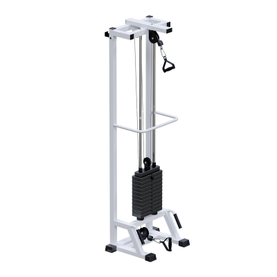 Грузоблочный стек состоит из металлических обрезиненных плит по 5 кг с хромированными направляющими. Регулировка нагрузки осуществляется металлической иглой-фиксатором. Передача усилия реализована тросом диаметром 5 мм в ПВХ-оплётке с разрывным усилием 500 кг и допустимой рабочей нагрузкой до 800 кг, что формирует высокий запас прочности.