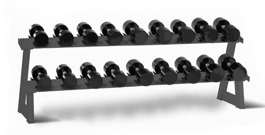 Стойка для хранения 9-ти пар гантелей. Цвет рамы: черный. Суммарный вес гантелей не должен превышать допустимый предел нагрузки в 800 кг. Габариты (ДхШхВ): 2000 х 420 х 825 мм.