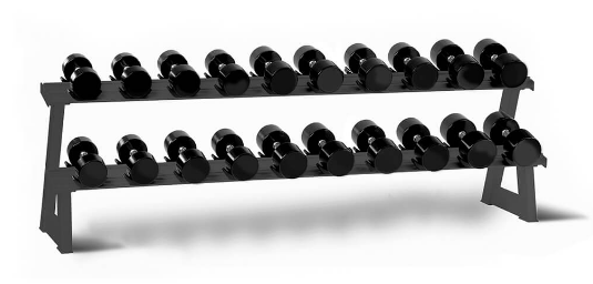 Стойка для хранения 10-ти пар гантелей. Цвет рамы: черный. Суммарный вес гантелей не должен превышать допустимый предел нагрузки в 1000 кг. Габариты (ДхШхВ): 2220 х 420 х 825 мм.