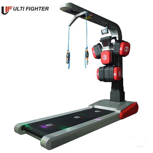 Светодиодный LED дисплей на тренажёре Показания: время работы программы, случайная цифра для удара Для просмотра подробной информации по ударам спортсмена на тренажере можно подключить внешнее оборудование по b Bluetooth — смартфон, компьютер, ноутбук, планшет или телевизор. Тренажер комплектуется программой для просмотра в двух режимах — стандартном (текстовая информация) и анимационном Показывается информация в виде мультфильма. Подвесные тросы — максимальный вес пользователя: 100 кг Стандартные программы: 4 — сила удара, скорость удара, реакция, бой Мощность двигателя номинальная: 3 л.с., максимальная: 4 л.с. Скорость: 1–22 км/ч Вес: 362 кг Размеры в сборе: 266 × 97 × 197-274 см Длина × Ширина × Высота (высота регулируется) Площадь бегового полотна: 176 × 60 см Длина × Ширина Максимальный вес пользователя: 150 кг Питание от сети: 220-240 В; 50-60 Гц